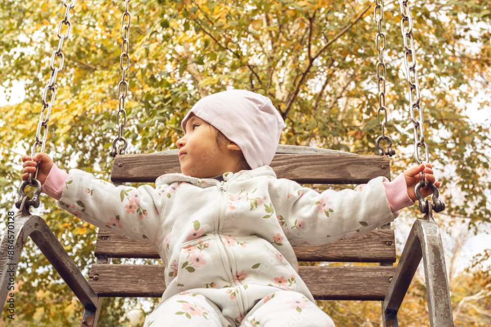 Cute toddler in floral outfit on wooden swing in autumn park. Captures childhood joy, outdoor play, and seasonal fun. Family lifestyle, parenting, or childhood development themes.