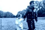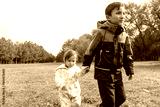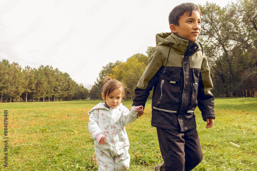 Boy and toddler girl holding hands while walking in park. Illustrates sibling relationships, family bonding, and outdoor recreation. Childhood development or family lifestyle themes.