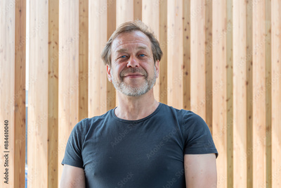 An elderly man 50-55 years old with a grey beard smiles in front of a wooden wall