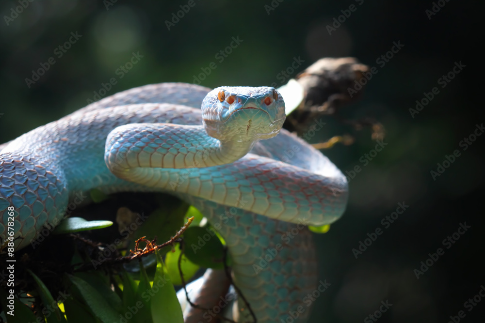 high venomous snake, blue viper snake closeup on branch, blue insularis,Trimeresurus Insularis