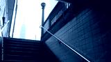 New York City underground subway globe, metro orb lamp. Empire State building. Metropolitan entrance stairway, Manhattan, 34 st. Midtown financial business district. Public transport station stairs.