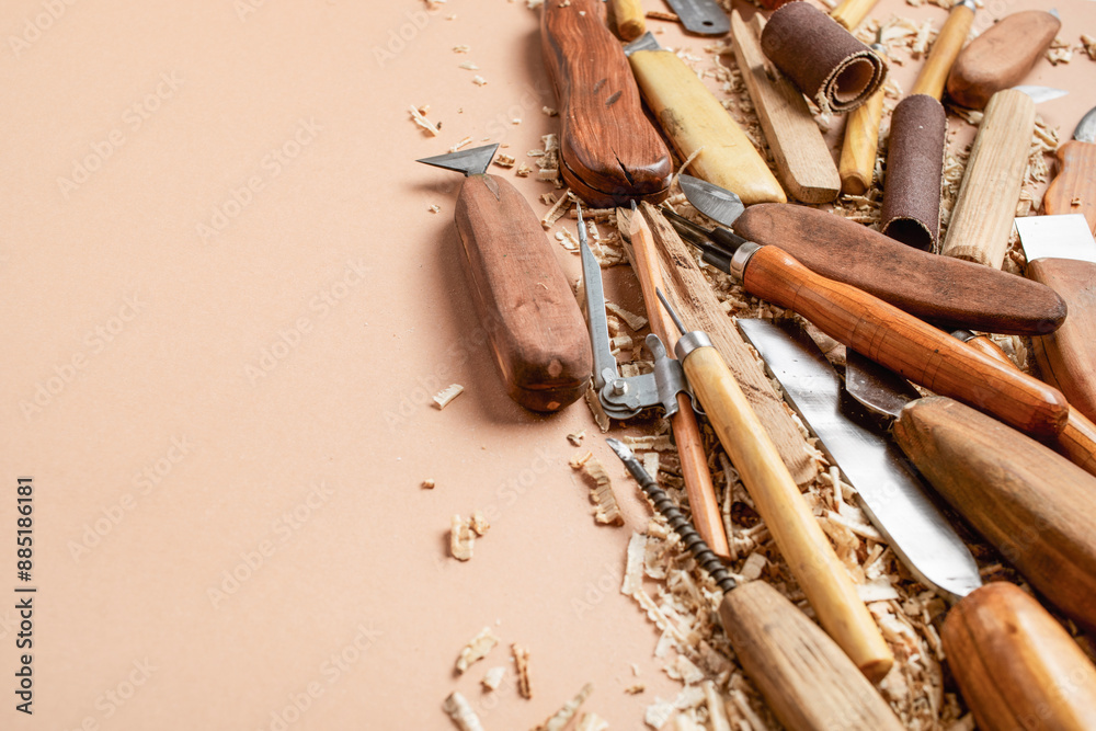 Carpentry workshop desk with set of different handmade carving tools for working with wood top view.
