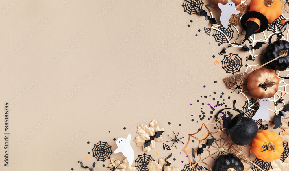 Halloween holiday frame with party decorations from pumpkins, bats, spider web and ghosts top view. Happy halloween greeting card on golden background flat lay style..