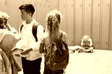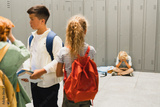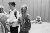 Lonely sad schoolboy crying at the school hall floor while his classmates ignoring him. Bullying at school problem. Social excluding concept