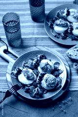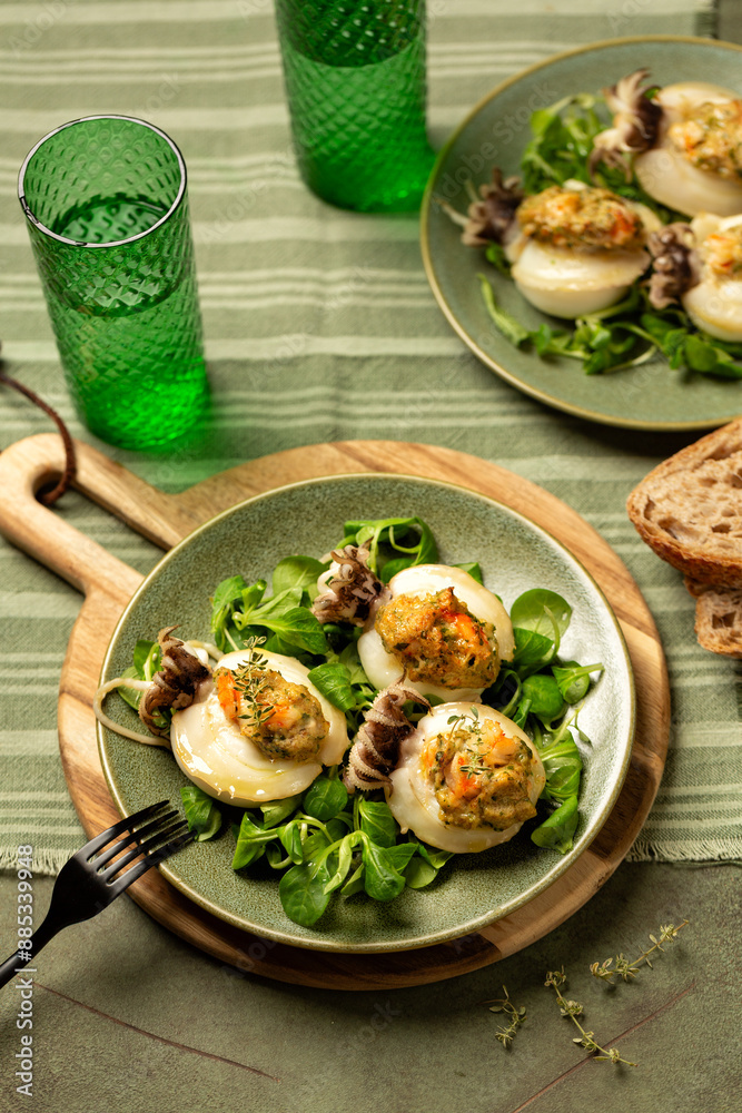 Baked Stuffed Cuttlefish, stuffed with bread crumbs, egg, chopped prawns. Green textile runner. Vertical image.