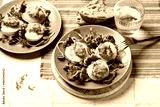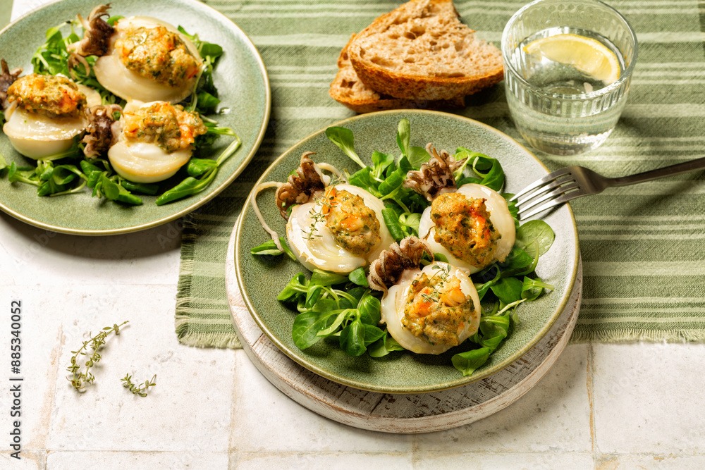 Baked Stuffed Cuttlefish, stuffed with bread crumbs, egg, chopped prawns. Italian sea food dish.