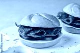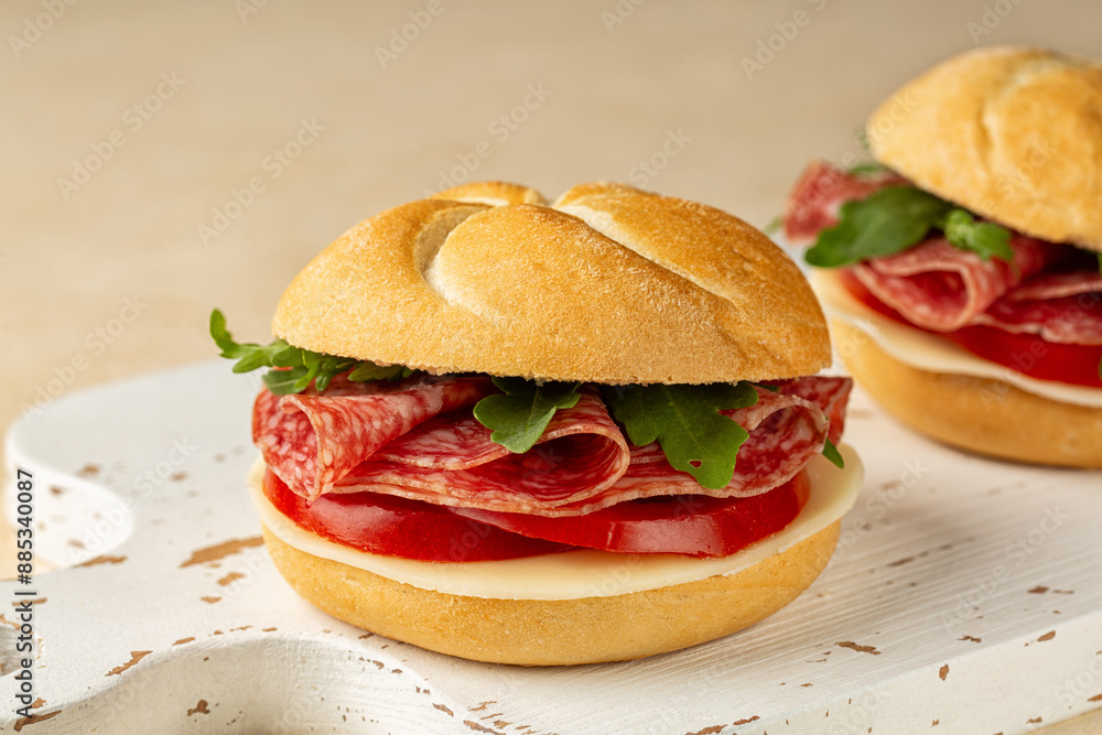Close up of sandwich or panino with sliced salami, sausage, tomato, cheese, rocket or arugula on a white wooden board.