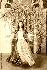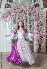 Beautiful woman in fantasy white and purple rococo style medieval dress dancing near door with pink flowers