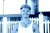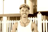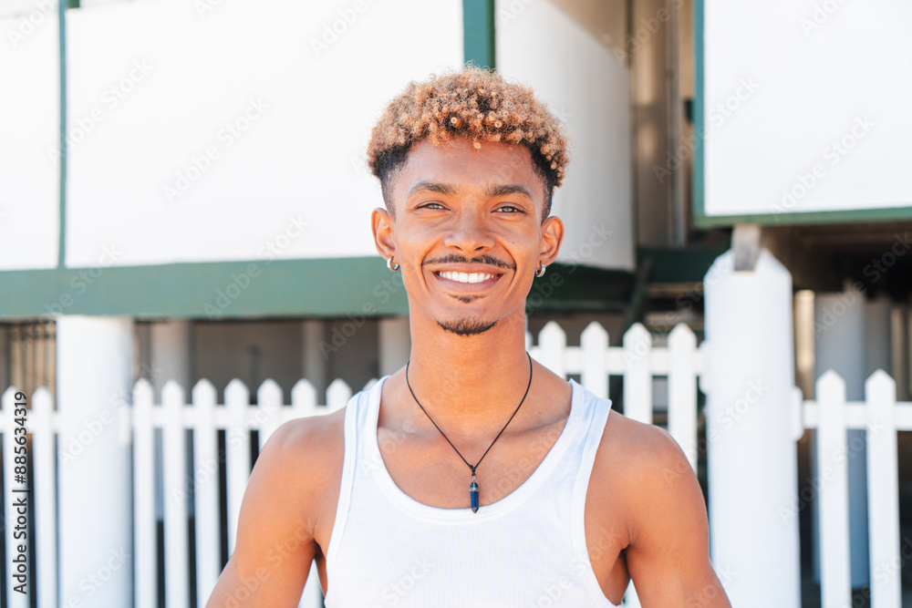 Close up portrait of a young brazilian guy smiling and looking at camera on his summer vacations. Man staring front, standingo on the sand of the beach. Adult friendly male posing at shoreline