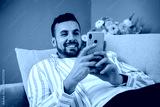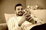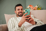 Handsome young man using a mobile phone lying on a sofa at his living room. Adult male browsing on internet with a cellphone application sitting on a couch at home. Caucasian guy watching a smartphone