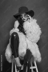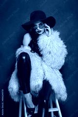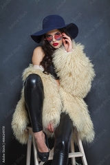 Sensual young brunette lady with makeup and long curly hair posing on blue background, fashion beauty studio portrait