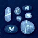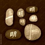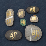 Chinese character ming or Japanese mei, meaning bright, written on a rock pebble
