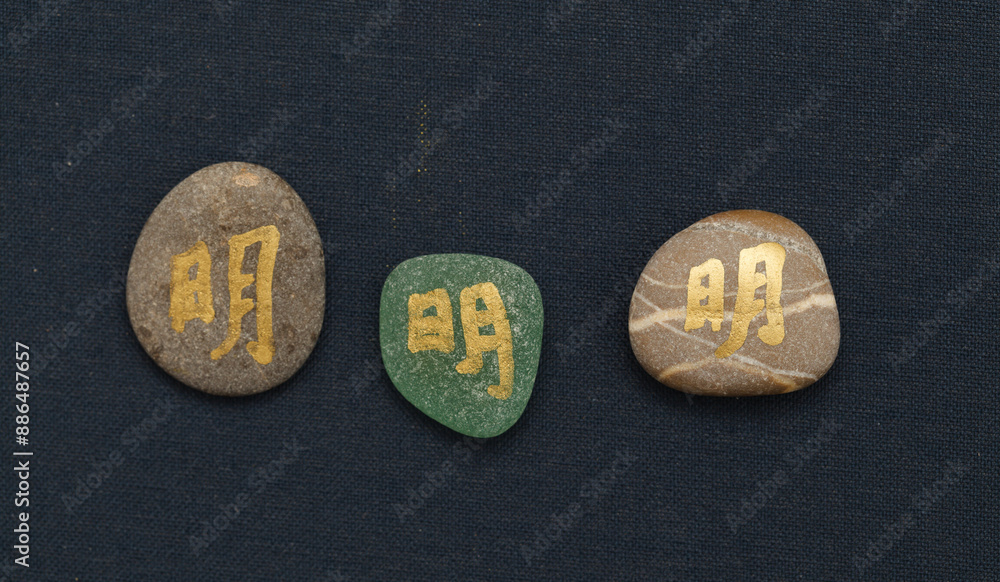 Chinese character ming or Japanese mei, meaning bright, written on a rock pebble