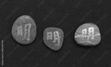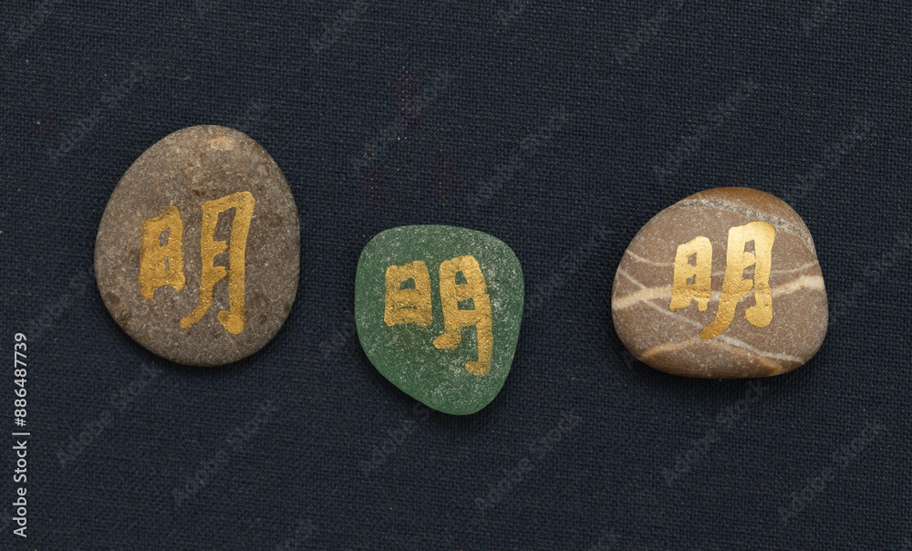 Chinese character ming or Japanese mei, meaning bright, written on a rock pebble