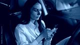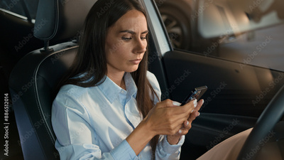 Tired upset worry anxiety Caucasian woman driver female girl sit in car auto businesswoman frustrated inside automobile holding mobile phone stressed business problem bad news trouble stress message