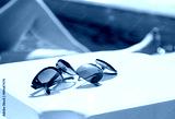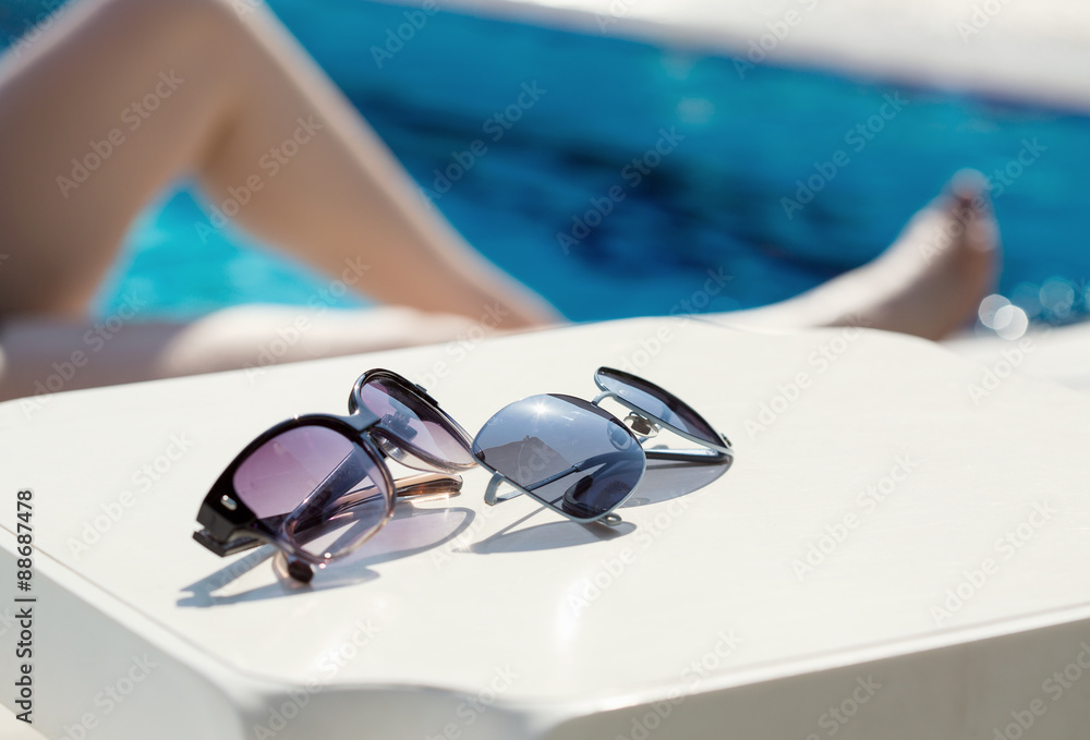 Sunglasses on a table near the swimming pool