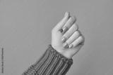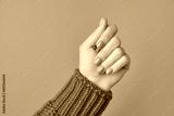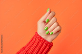 Beautiful womans hands with spring autumn nail design on orange background. Manicure, pedicure beauty salon concept