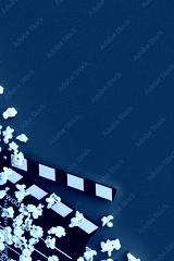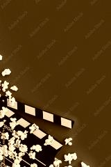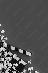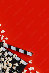 Popcorn and clapperboard on a red background. Flat lay, copy space