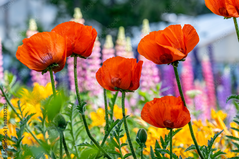 Blooming red poppies on the lawn in summer close-up.