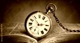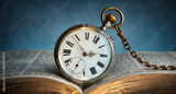 The clock lies on an old book. Clock as a symbol of time, the book is a symbol of knowledge and science. Concept of time, history, science, memory, information. Vintage watch, clock background.
