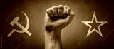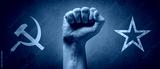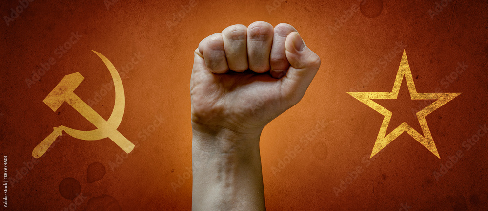 Fist of a protester against the background of the Soviet flag. Symbol of the struggle for rights. Soviet propaganda. Concept on the theme of the USSR, socialism, communism.
