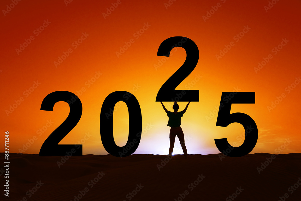 2025, silhouette of a strong woman standing in the sunrise, women new year greeting card