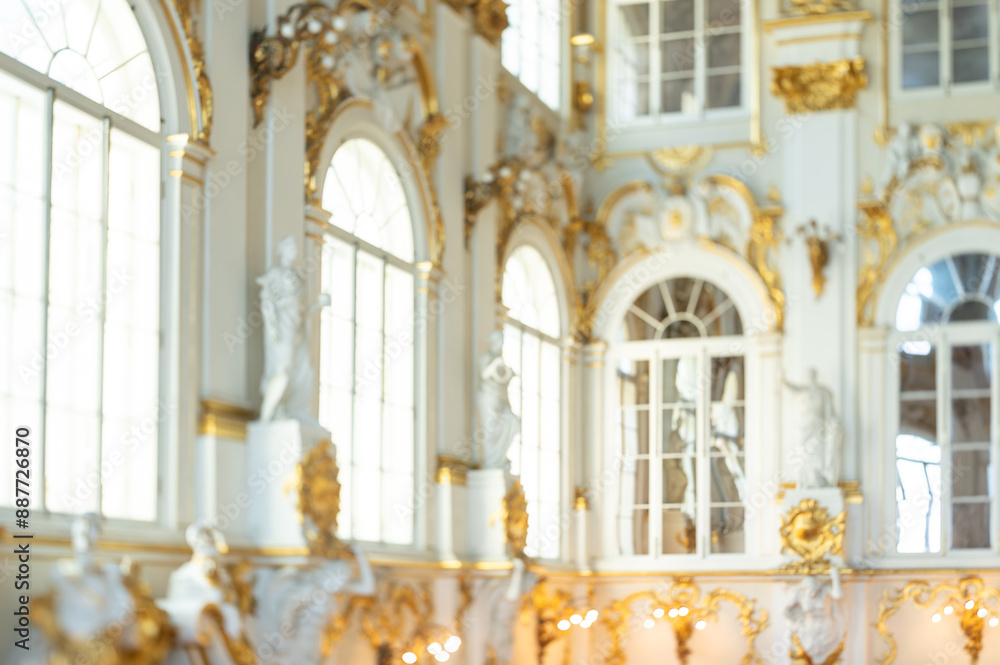 Blurred Luxurious Imperial Palace Interior, Opulent Golden Ornaments, White Sculptures, Grand Historical Architecture, Sunlit Elegant Space for Royal Ambiance Background