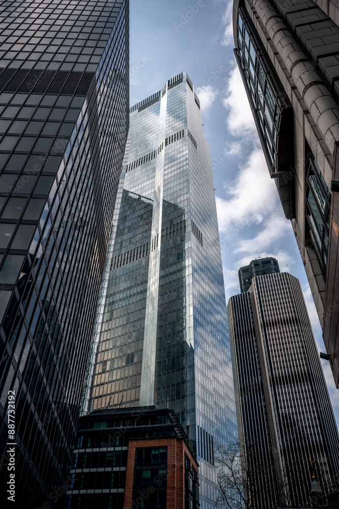 Hochhausgebäude mit vielen Fenster und Spiegelung in London mit blauen Himmel