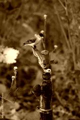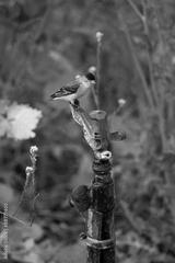 Male Lesser Goldfinch seeks water on a leaky water sprinkler