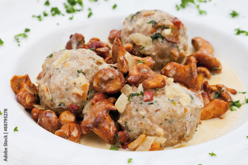 Close up von Semmelknödel mit Pfifferlingen in Rahm