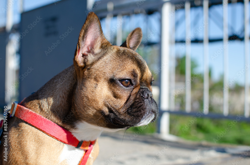 Cute French Bulldog puppy, eight weeks old fawn colored female, the baby dog looking curiously
