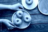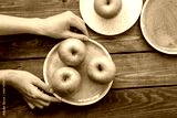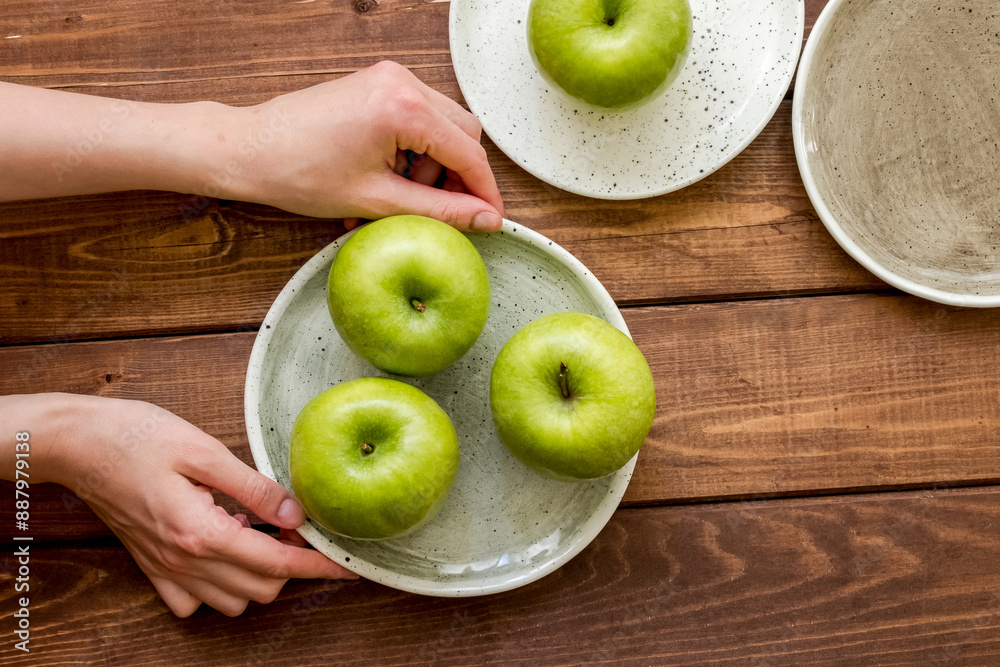 summer food with green apples on wooden background top view