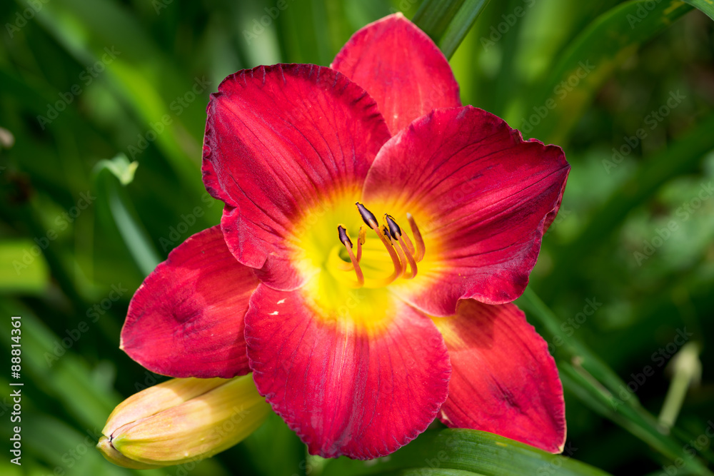Red daylily (Hemerocallis). Close-up.