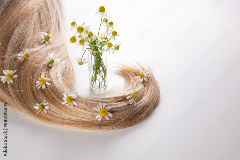 Fresh chamomile flowers and hair on the white background. Hair treatment concept. Close up