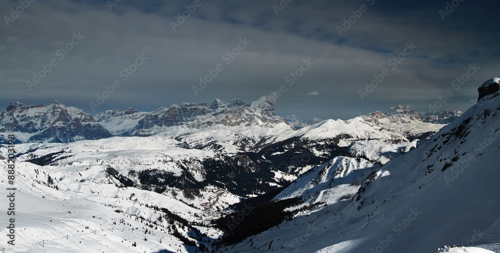 Panoramic winter view of Alpine mountains. Dolimites. Sella Ronda. Alta Badia. South Tirol. Italy.