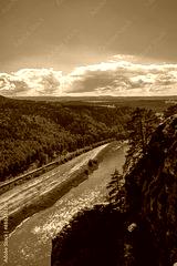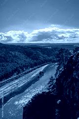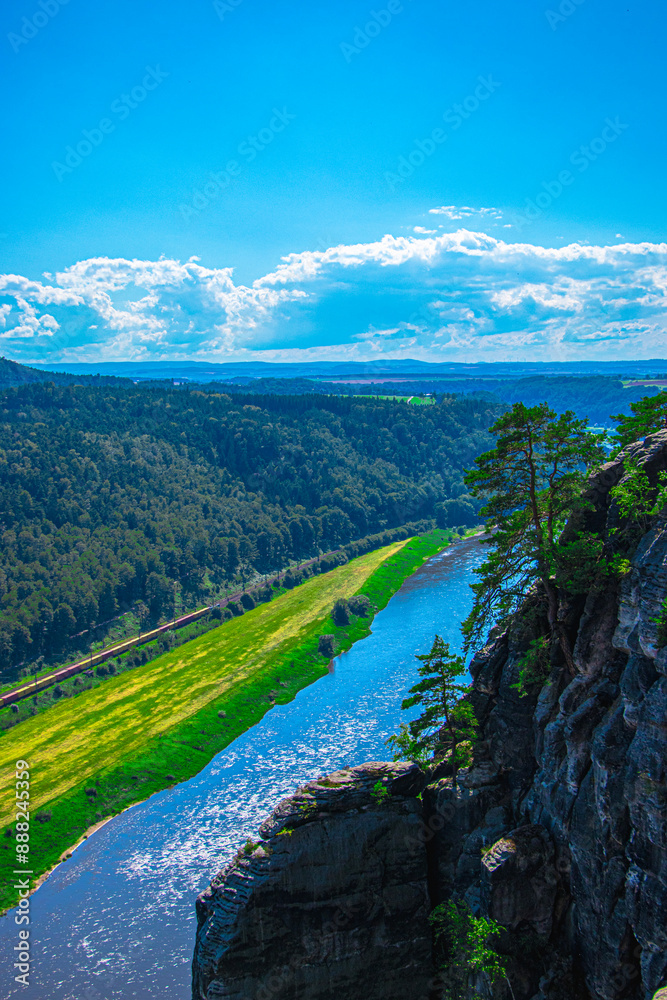 a narrow river flows in the mountains, many green trees, blue sky, clouds