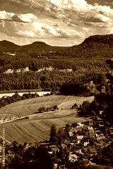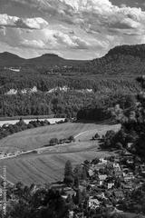 houses stand in the mountains, view from above, small white houses with red roofs, many small houses in the mountains, small town in the mountains
