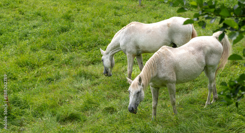 Dwa białe koń na pastwisku. Hodowla koniu. Wypas zwierzat pod lasem.
