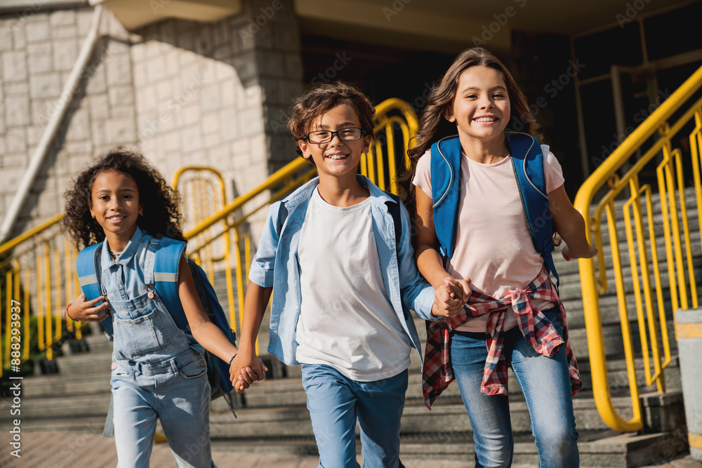 Happy kids elementary school pupils children with rucksacks backpack walking holding hands at school yard running out outside at the end of the lessons. Finish school and summer vacation concept.