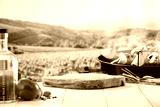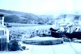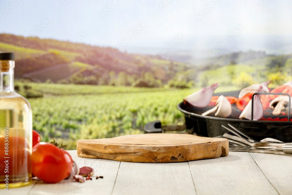 Olive oil and garlic and peppers and tomatoes and vegetables on wooden table top with space for advertised products and food. Summer grilling and good healthy food idea. Blur green garden background.