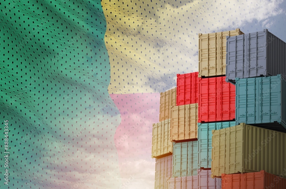 Benin flag and big stack of shipping cargo containers in docks with sky background close up