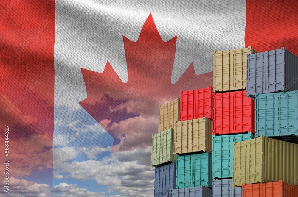 Canada flag and big stack of shipping cargo containers in docks with sky background close up