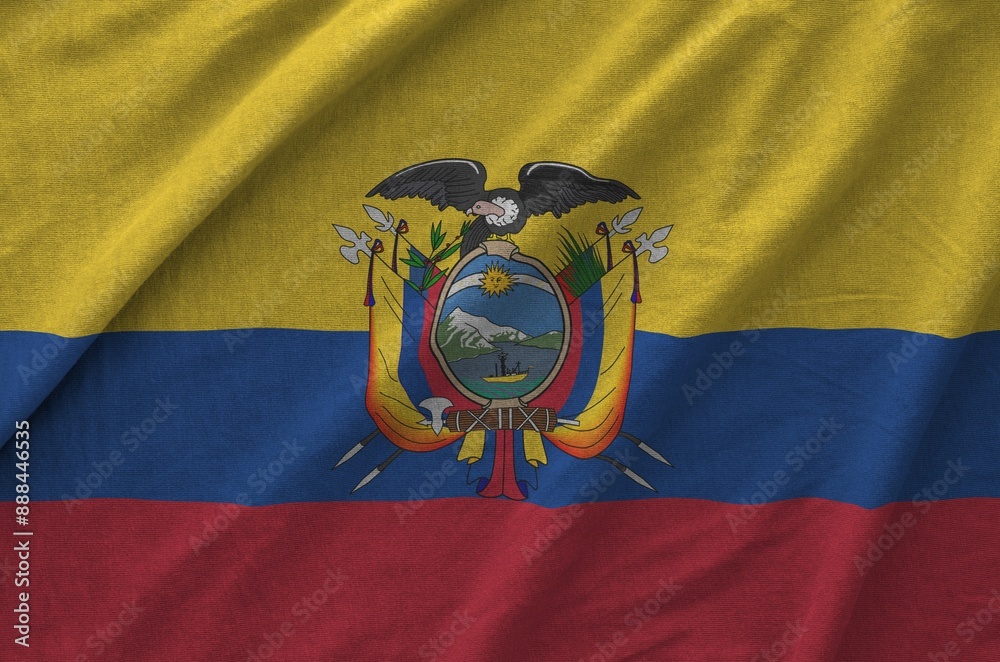 Ecuador flag depicted on folded wavy fabric of old cloth close up