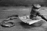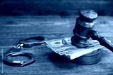 Dollar banknotes, handcuffs and judge gavel on wood table