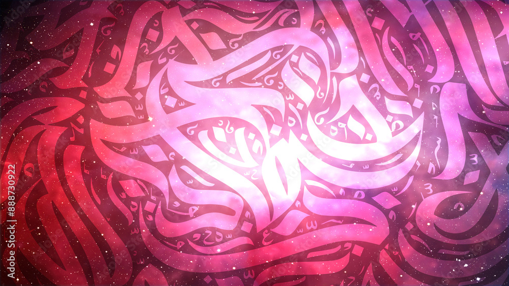 Arabic calligraphy wallpaper on a wall with a Pink background and old paper interlacing. Translate "Arabic letters"