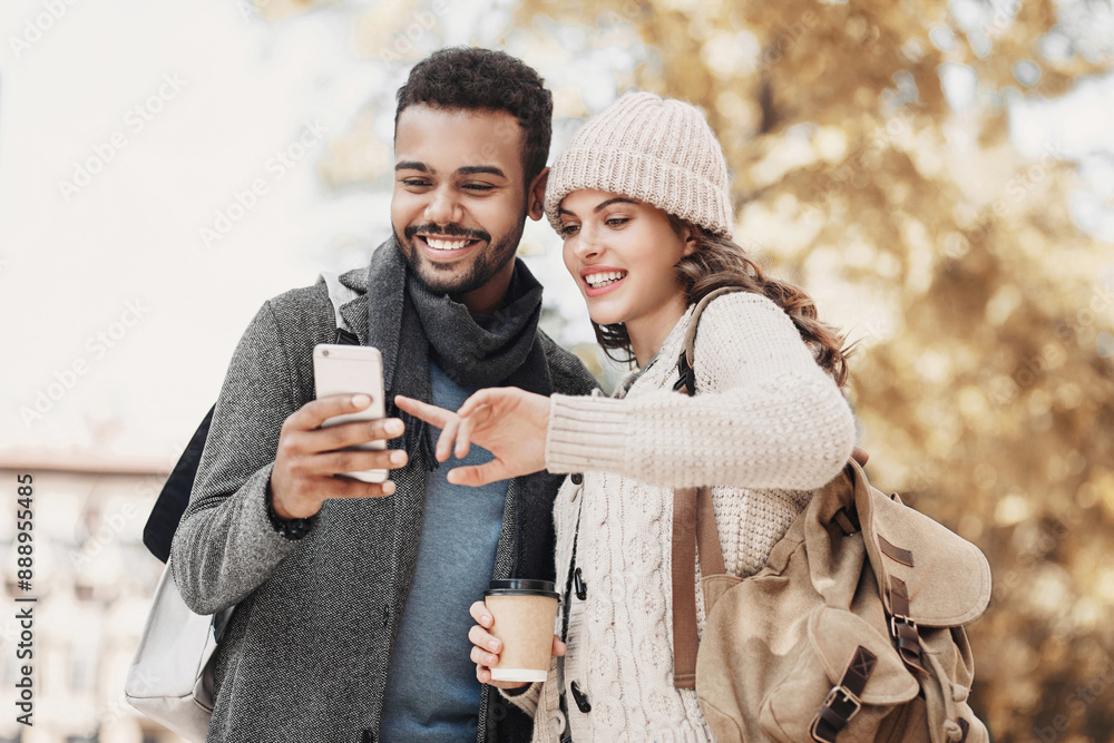 Beautiful happy young couple using smartphone outdoors. Joyful smiling woman and man looking at mobile phone in a city, autumn portrait. Love, technology, communication, winter holiday travel concept