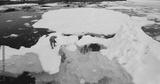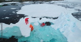Science exploration on South Pole. People explore global warming in Antarctica. Group of scientists in orange wetsuits take samples and measure melting glacier water, climate change problem. Aerial