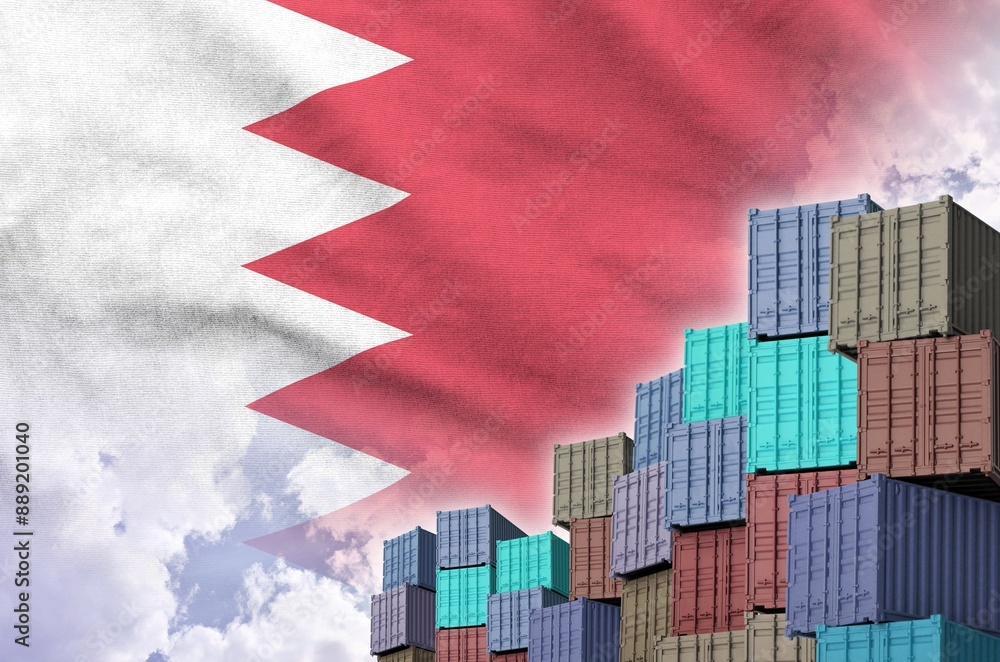 Bahrain flag and big stack of shipping cargo containers in docks with sky background close up