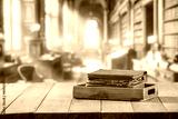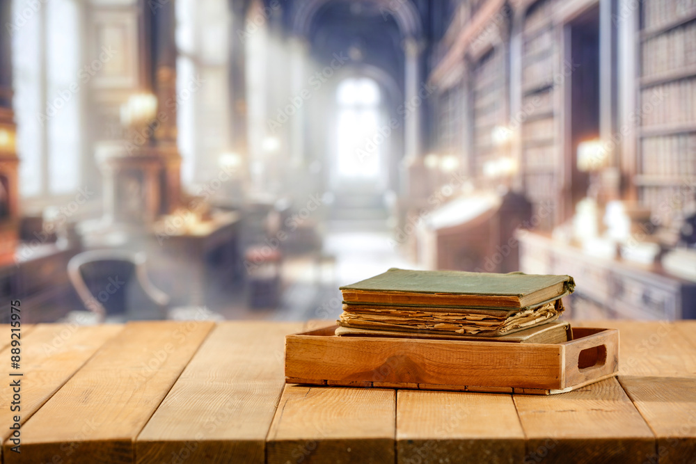 Library interior and wooden table with old books with copy space for products. Bright window background. Educational concept for montage objects and accessories display.