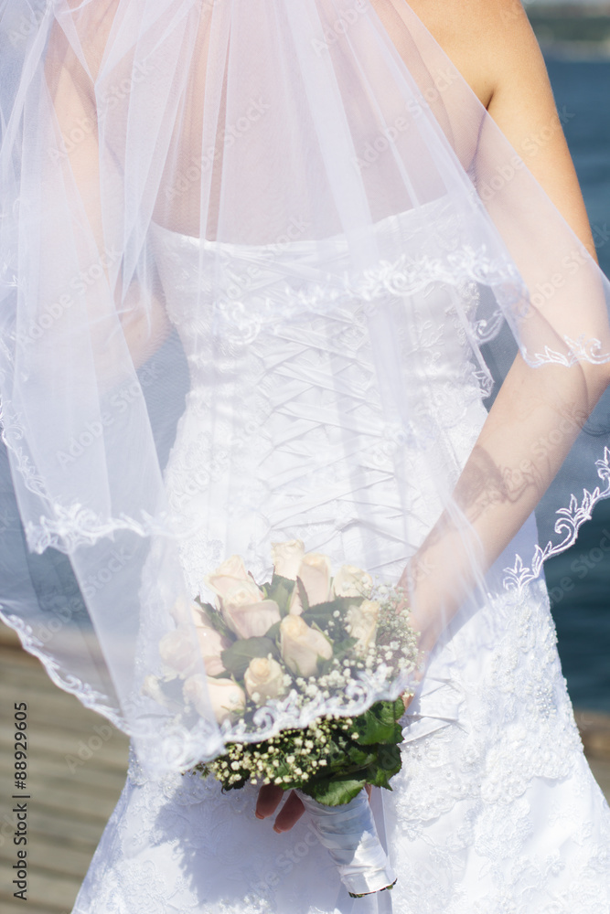 Bride is wearing dress with a bouquet in hand